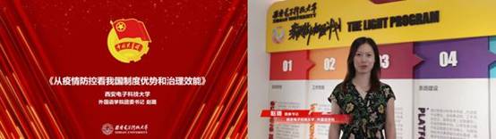 外国语学院团委书记赵璐在《从疫情防控看我国制度优势和治理效能》中讲到,中华民族的强大最根本的原因是中国共产党领导全国人民建立了中国特色社会主义制度,形成了根本制度和基本制度,不断加强和完善国家治理,体现了我国制度优势和治理效能。