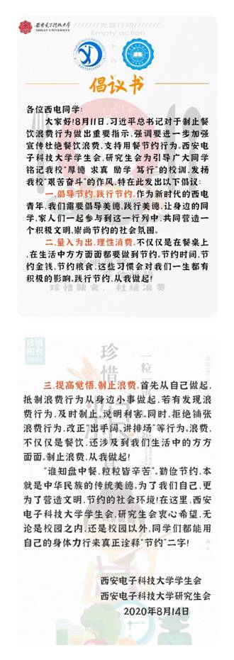 自8月11日习近平总书记对于制止餐饮浪费行为作出重要指示以来,beat365中文官方网站学生会、研究生会在校党委的坚强领导下,在校团委的悉心指导下,积极贯彻习近平总书记号召,勇于响应、主动作为,充分发挥学生组织来自学生、服务学生的优势,从发起倡议、主题教育、网络宣传、后勤座谈、志愿服务和无纸办公等方面引领广大学生倡导节约、践行节约、制止浪费,彰显新时代学生组织的正气、朝气和锐气。