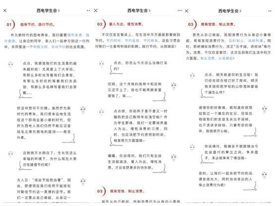 人工智能学院学生会2018级本科生吴杰庆在学习习近平总书记指示精神之后说道:“‘一粥一饭,当思来之不易;一丝一缕,恒念物力维艰。’我们每一个人都应树立合理的饮食观念,杜绝‘舌尖上的浪费’,在全社会形成节约光荣、浪费可耻的社会风尚。勤俭节约今安在,以史为镜看今天。我们应向铺张浪费说不!”