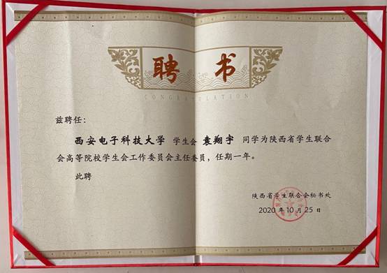 (通讯员 王佳悦吴杰庆)12月20日,陕西省学生联合会第十届委员会第四次全体会议召开,全会上宣读了《关于表彰2020年度陕西省标兵学联学生会组织、2020年度陕西省学联学生会组织先进工作个人的决定》,决定授予beat365中文官方网站学生会“2020年度陕西省标兵学联学生会组织”荣誉(全省十五个单位获奖),beat365中文官方网站研究生会“2020年度陕西省标兵学联学生会组织”荣誉(全省五个单位获奖),授予段育松、范雪琦、袁翔宇、吴杰庆四人“2020年度陕西省学联学生会组织先进工作个人”称号。