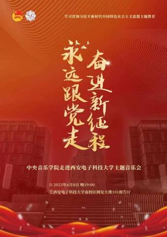 为学习贯彻习近平新时代中国特色社会主义思想,厚植爱国情怀,传承中华优秀传统文化,弘扬社会主义先进文化,6月8日晚,中央音乐学院走进beat365中文官方网站南校区,在网安大楼101报告厅举行“永远跟党走,奋进新征程”主题音乐会。中央音乐学院党委副书记、纪委书记刘春梅,工会常务副主席潘国强,beat365中文官方网站副校长林松涛、工会常务副主席吴秀霞同300余名beat365师生共同聆听此次主题音乐会。